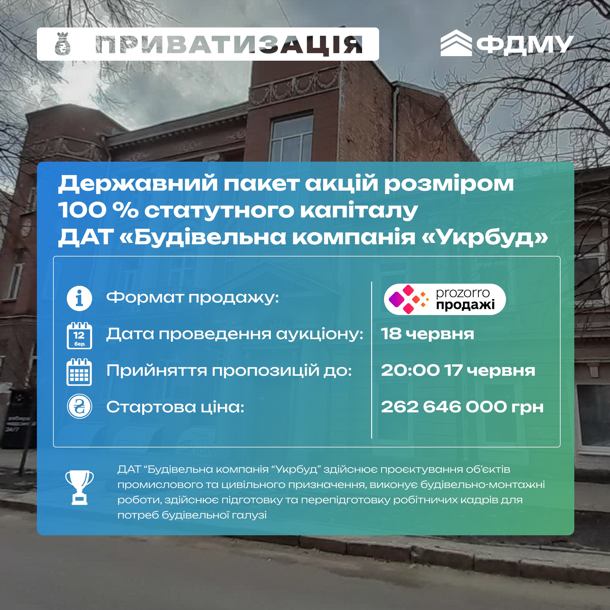 Онлайн-аукціон із приватизації державного пакета акцій "Укрбуду" відбудеться 18 червня в електронній торговій у системі "Prozorro.Продажі".