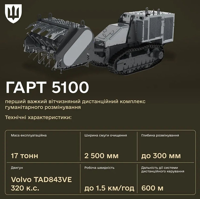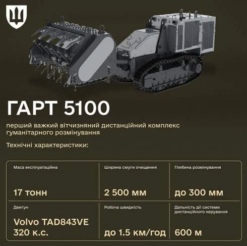 В Україні сертифікували важкий дистанційний комплекс розмінування ГАРТ 5100. Сертифікат видав Державний науково-дослідний інститут випробувань і сертифікації озброєння та військової техніки, повідомило Міністерство оборони.