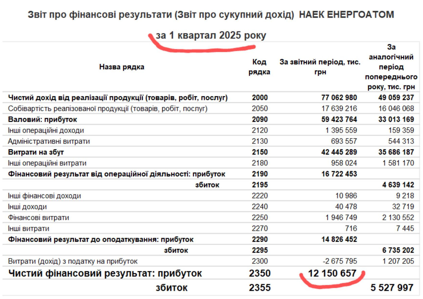 Державний "Енергоатом" за підсумками першого кварталу 2025 року отримав 12,15 мільярда гривень чистого прибутку, порівняно зі збитком у розмірі 5,53 млрд грн за аналогічний період минулого року.