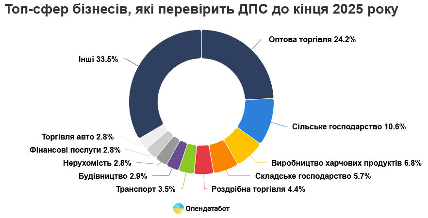 Найбільше до кінця року перевірятимуть бізнеси та компанії, що працюють у сфері оптової торгівлі (272 компанії або 24%), сільського господарства (119 або 11%), виробництва харчових продуктів (76 або 7%), складського господарства та логістики (64 або 6%) та роздрібної торгівлі (49 або 4%).