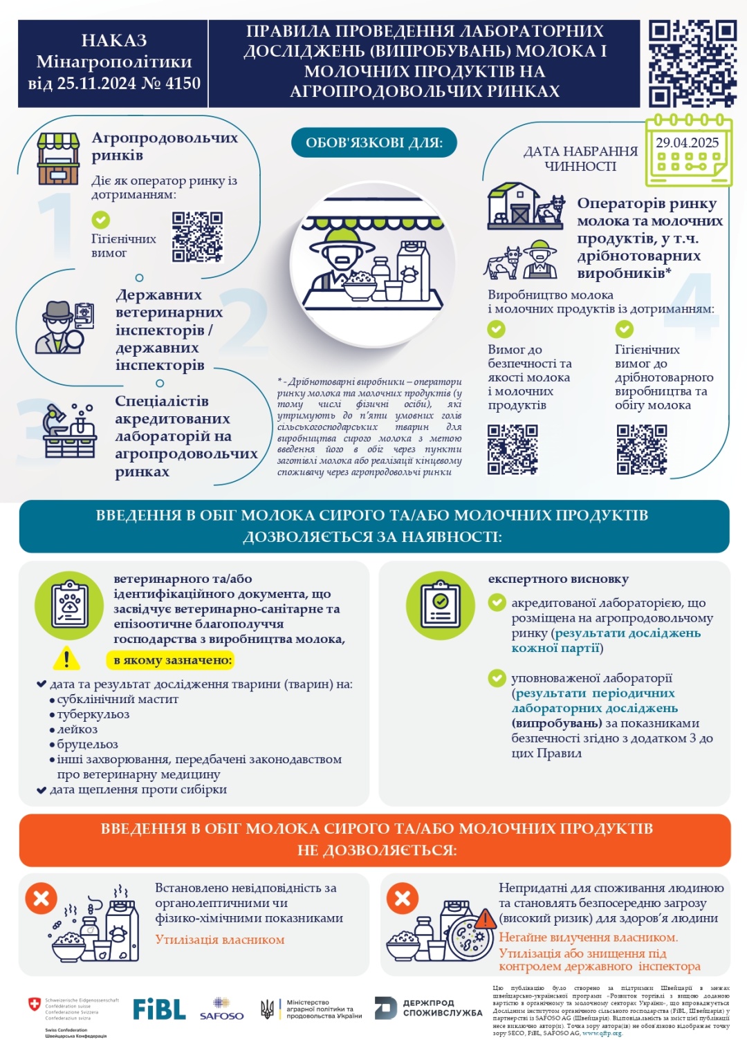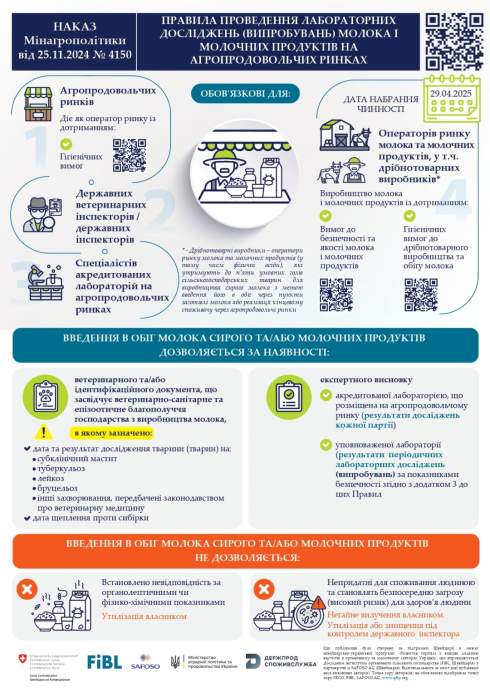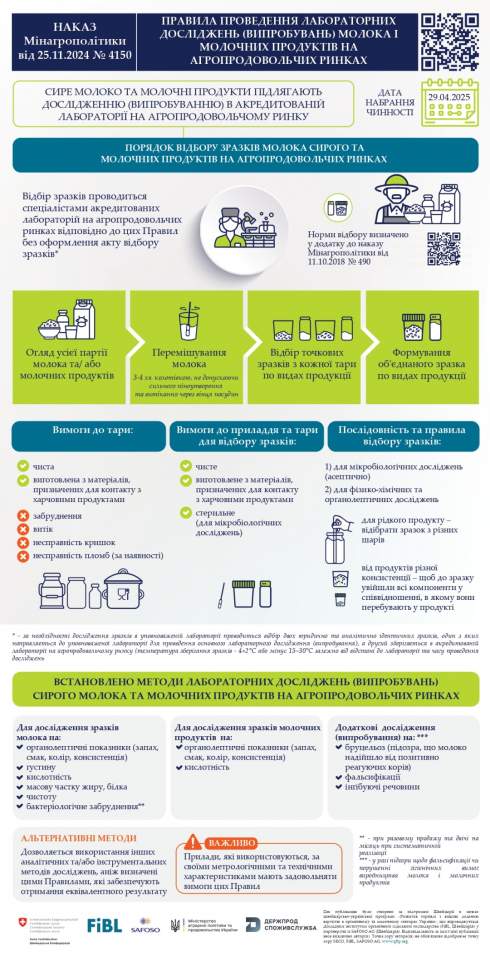 Крім того, встановлюються вимоги щодо проведення лабораторних досліджень (випробувань) молока сирого та виготовлених із нього молочних продуктів (крім продукції промислового виробництва), що вводяться в обіг операторами ринку, у тому числі, дрібнотоварними виробниками, кінцевому споживачу через агропродовольчі ринки.