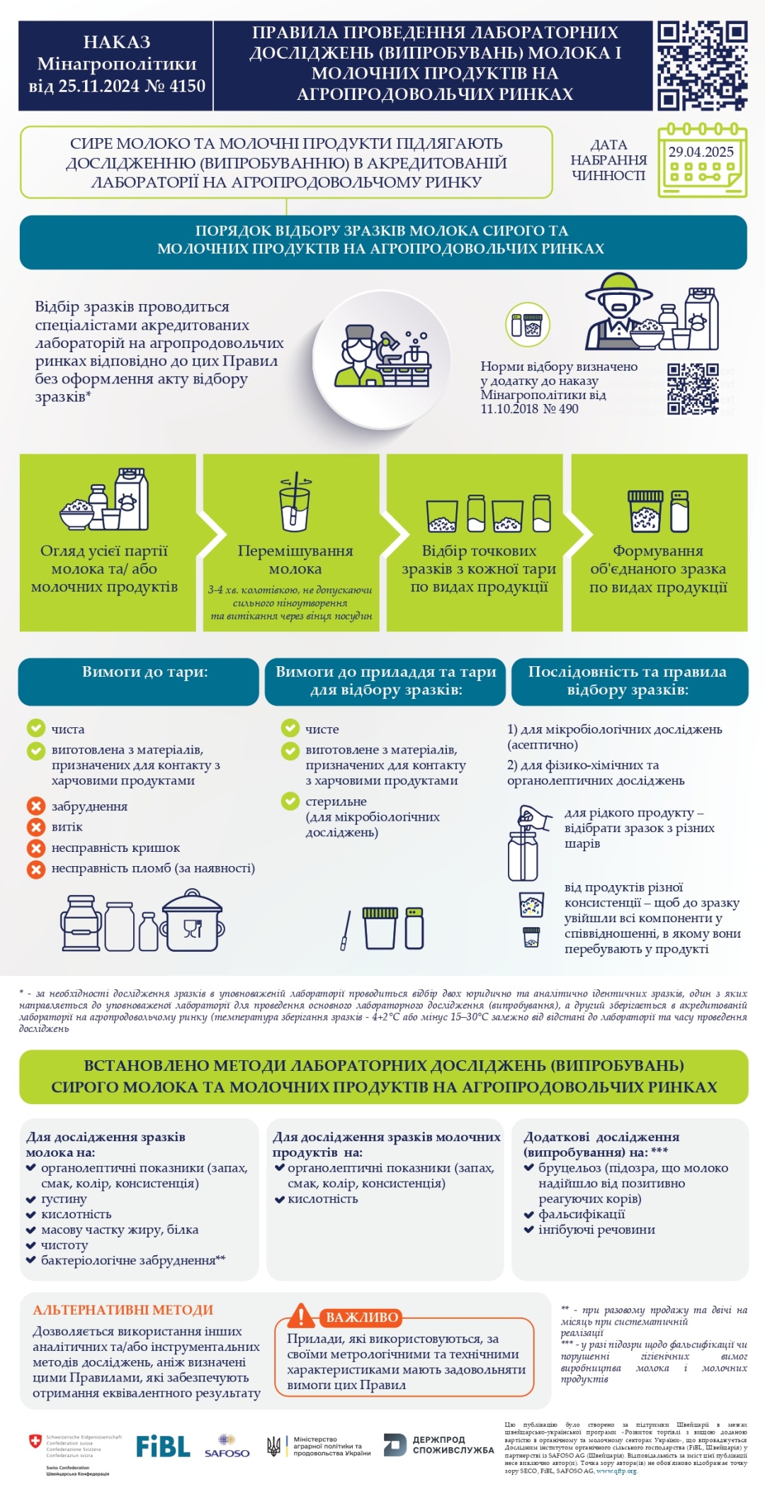 Зазначається, що документом передбачено запровадження вимог до відбору зразків сирого молока та молочних продуктів, а також визначення показників якості та безпечності до сирого молока та молочних продуктів і періодичність контролю цих показників.