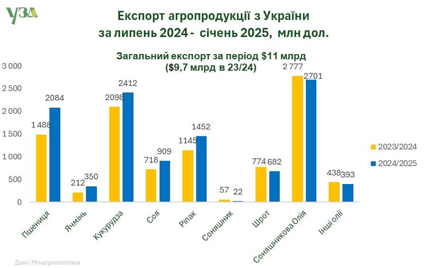 У липні-січні 2024/2025 маркетингового року (МР) Україна експортувала зернових та олійний на суму $11 мільярдів, що на $1,3 мільярда більше за аналогічний період минулого сезону.