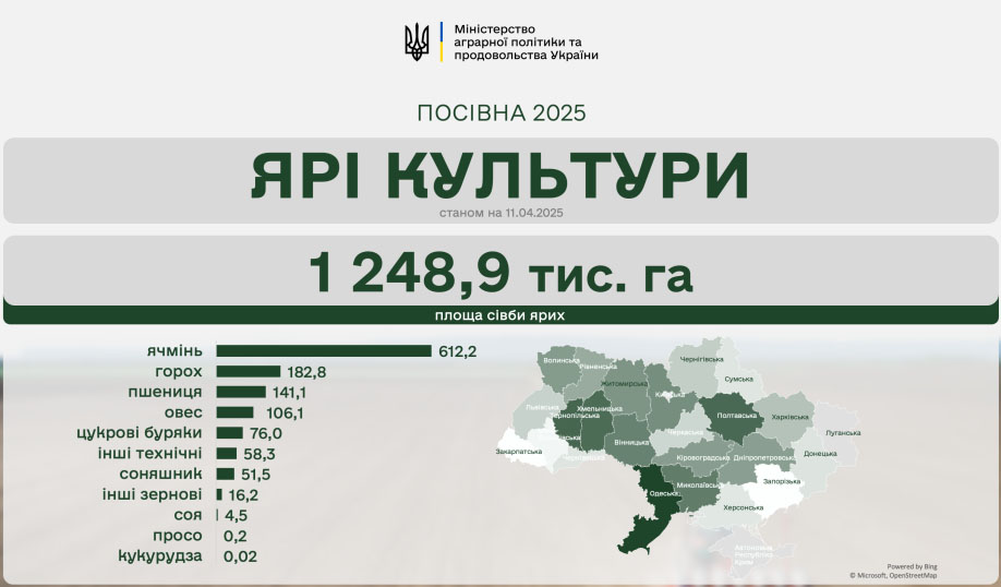 Станом на 11 квітня 2025 року аграрії всіх областей України засіяли 1 058,6 тис. га ярих зернових та зернобобових культур.
