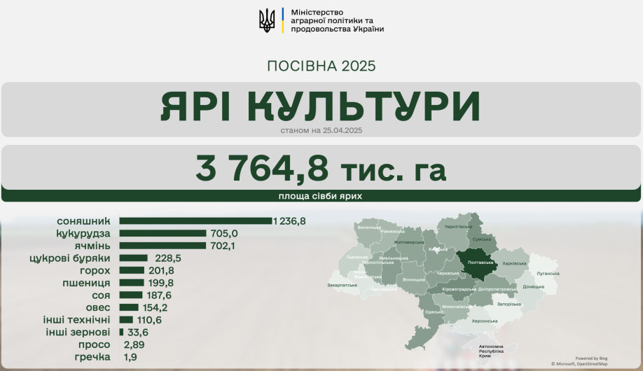 Полтавська область лідер за темпами сівби - 251,5 тис. га, з яких пшениця займає 4,5 тис. га, ячмінь - 69,1 тис. га, горох - 9,6 тис. га, овес - 3,1 тис. га, кукурудза - 165,2 тис. га.