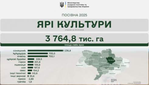 За даними галузевого відомства, найбільша площа посівів припадає на кукурудзу - 705 тис. га, ячмінь - 702,1 тис. га, ярої пшениці вже засіяно 199,8 тис. га, гороху - 201,8 тис. га, вівса - 154,2 тис. га.