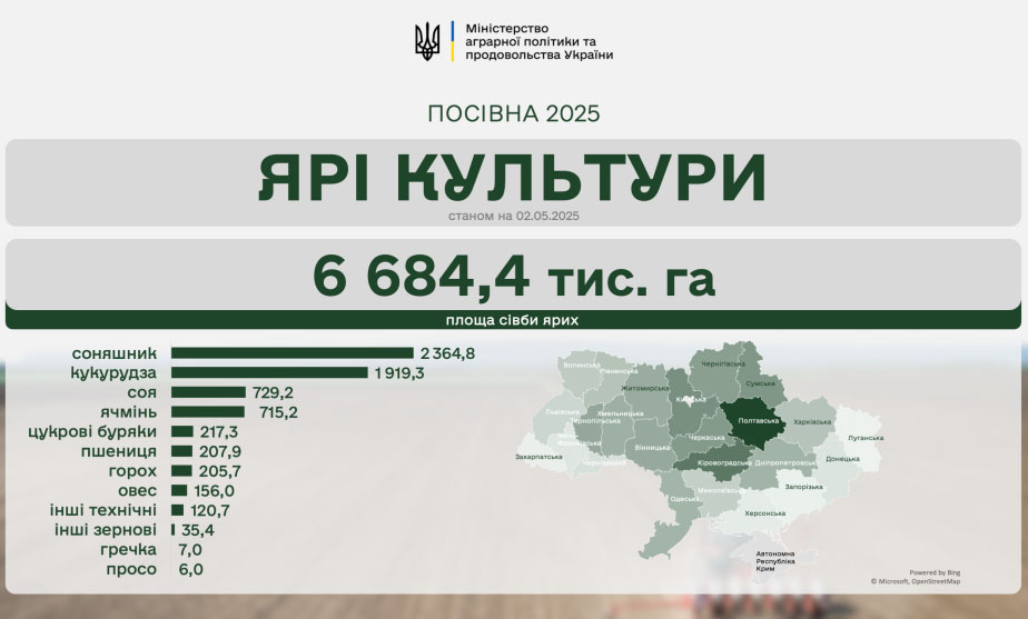 Найбільша площа посівів припадає на кукурудзу - 1 919,3 тис. га, ячмінь - 715,2 тис. га, ярої пшениці вже засіяно 207,9 тис. га, гороху - 205,7 тис. га, вівса - 156 тис. га. Гречка засіяна на площі 7 тис. га, просо - 6 тис. га.