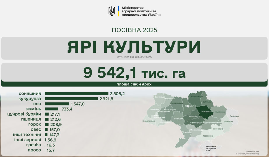 Аграрії всіх областей України станом на 9 травня 2025 року засіяли 4,32 млн га ярих зернових та зернобобових культур, а також 5,2 млн га технічних культур.