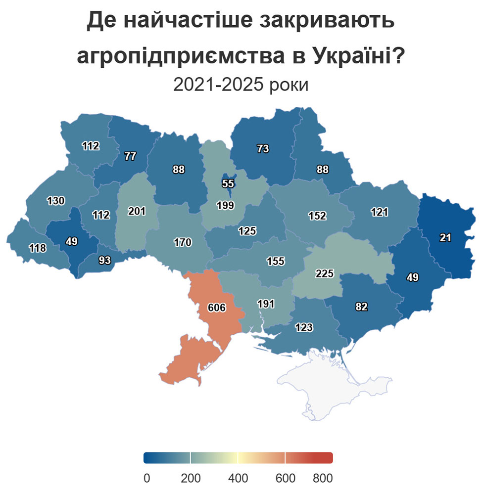 Закривають агробізнес найчастіше теж на півдні та в центрі: в Одеській області за чотири роки ліквідовано 606 компаній, у Дніпропетровській - 225, Хмельницькій - 201, Київській - 199 і Миколаївській - 191. Найменше "мінусів" на Луганщині (21), Донеччині та Івано‑Франківщині (по 49) і в самому Києві (55).