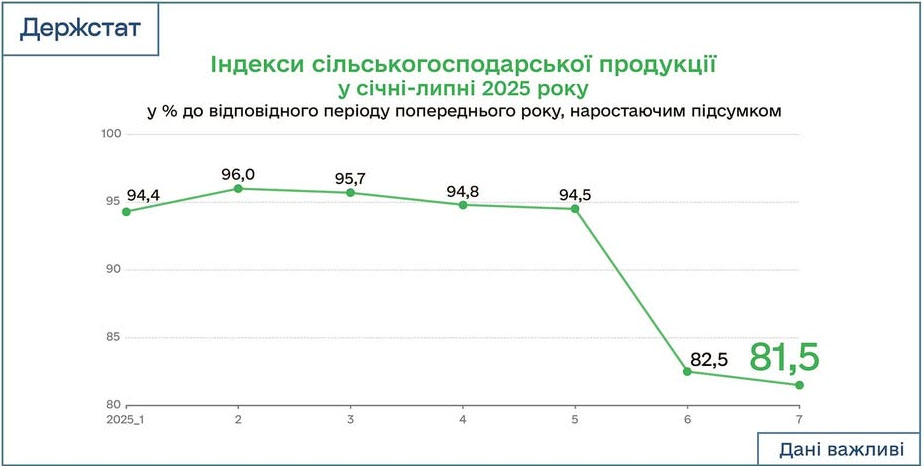 За розрахунками фахівців, у січні - липні 2025 року індекс сільськогосподарської продукції в Україні становив 81,5% до січня - липня торік. За видами продукції найбільше постраждало рослинництво - скорочення до 74,5%, тоді як тваринництво продемонструвало стабільніший результат - індекс становить 95,3%.
