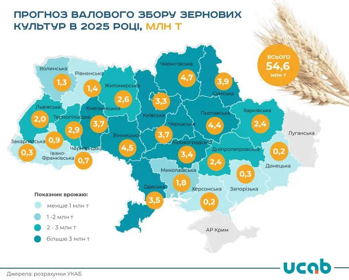 Головною житницею у 2025 році, згідно з прогнозом, буде Вінницька область (6,1 млн тонн).