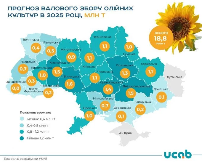Врожай зернових прогнозується на рівні 54,6 млн т (-3% до показника минулого року), а олійних культур - 18,8 млн т (-11%).