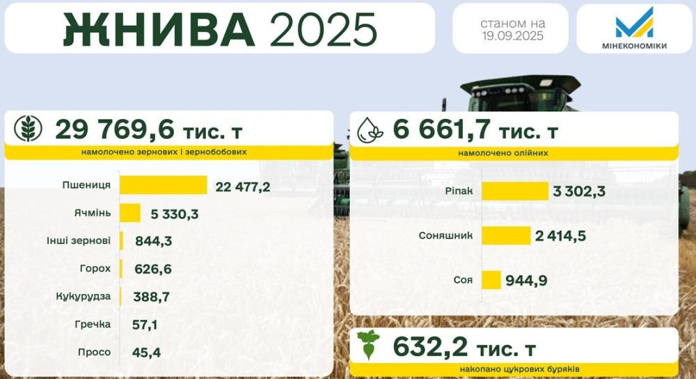 Зокрема, станом на 19 вересня 2025 року в Україні намолочено: пшениці понад 22,47 млн т з площі понад 5 млн га; ячменю - 5,33 млн т (1,34 млн га), гороху - 626,6 тис. т (266 тис. га), а кукурудзи - 388,7 тис. т (із 90,3 тис. га).
