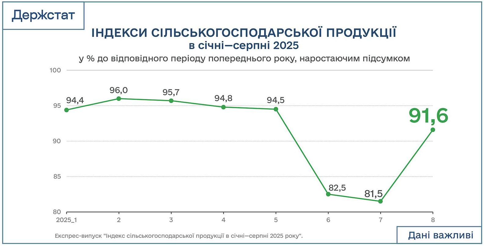 Обсяг виробництва сільськогосподарської продукції за вісім місяців 2025 року скоротився порівняно із аналогічним періодом 2024 року на 8,4%, тоді як за результатами семи місяців падіння сягало 18,5%, повідомила Державна служба статистики у п'ятницю.