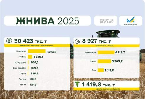 "Станом на 26 вересня 2025 року в Україні вже зібрано 30 423 тис. тонн зернових культур на площі 7 213,8 тис. га. Обмолочено 63% площ, засіяних цими культурами", - йдеться у повідомленні.