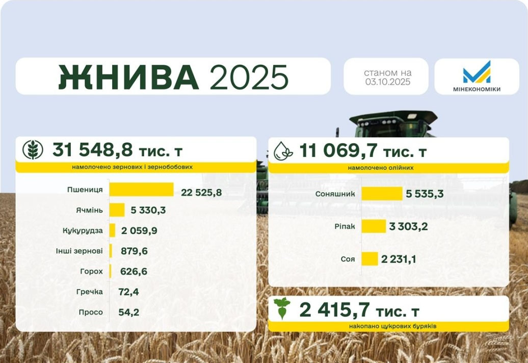 "Станом на 3 жовтня 2025 року в Україні вже зібрано 31 548,8 тис. тонн зернових культур на площі 7 213,8 тис. га. Обмолочено 65% площ, засіяних цими культурами", - йдеться у повідомленні.