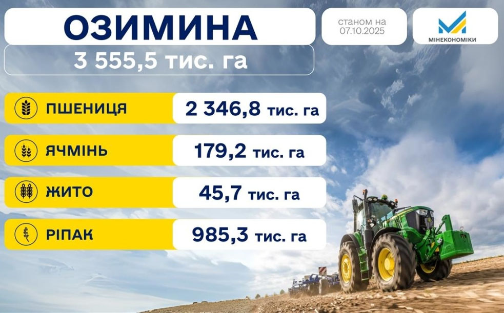 «Станом на 7 жовтня 2025 року українські аграрії засіяли 3 557,0 тис. га озимих культур. Це майже 50% від прогнозованих площ. Озимі на зерно сіють в усіх областях України», - йдеться у повідомленні.