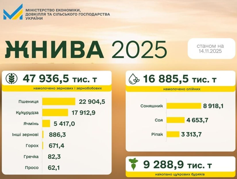 В Україні станом на 14 листопада зібрано понад 47,94 млн тонн зернових культур на площі 9,82 млн га, обмолочено 84% площ.