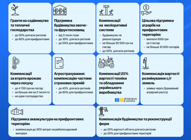 Щодо компенсації витрат на меліорацію, держава покриває до 80% витрат (без ПДВ) на ремонт, реконструкцію та будівництво зрошувальних систем і насосних станцій у прифронтових і деокупованих регіонах.