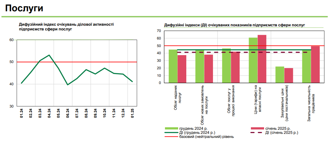 Підприємства сфери послуг також послабили оцінки щодо своїх економічних перспектив на тлі сезонного фактору, а також зростання виробничих витрат: секторальний індекс становив 41.1 у січні. Однак оцінка була дещо вищою, ніж у січні 2024 року (40.4).