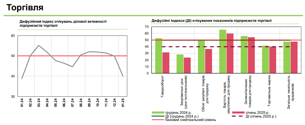 Оцінки підприємств торгівлі щодо своєї ділової активності на початку року традиційно суттєво нижчі, ніж в інші місяці: секторальний індекс у січні становив 40.0. Водночас такий показник є вищим, ніж у січні 2024 року (38.9).