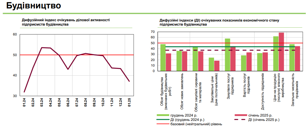 Підприємства будівництва втретє поспіль надали найстриманіші оцінки своїх поточних економічних результатів на тлі сезонності будівельних робіт та дефіциту кваліфікованих кадрів: секторальний індекс у січні становив лише 37.2. Водночас оцінка відчутно поліпшилась порівняно з січнем 2024 року (31.9).