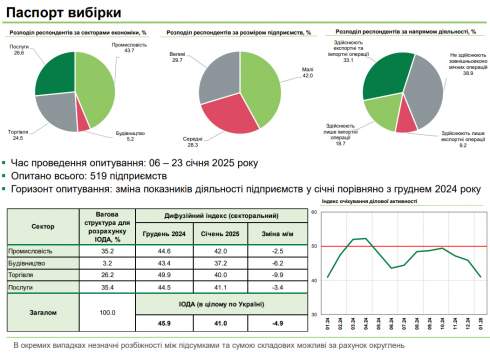 Індекс очікувань ділової активності (ІОДА) у січні 2025 року становив 41.0, що відповідає рівню січня 2024 року. Традиційно в січні бізнес послаблює свої оцінки поточної ділової активності порівняно з іншими місяцями, що пов'язано з сезонними факторами.