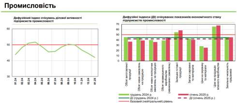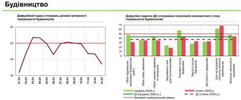 Підприємства промисловості стриманіше оцінили результати своєї поточної діяльності, зважаючи на руйнування виробничих потужностей, нестачу інвестицій у виробничий капітал, дефіцит кадрів і збільшення виробничих витрат: секторальний індекс у січні становив 42.0 (у січні 2024 року - 43.7).