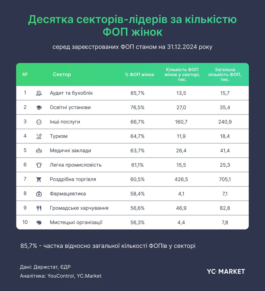 Станом на 31 грудня 2024 року в Україні було зареєстровано 2,3 млн фізичних осіб-підприємців (ФОПів), з яких на жінок припадає 48,1% - 1,1 млн, що є найвищим показником з 2020 року. Про це свідчать дані дослідження YC.Market.