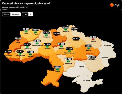 "Середня вартість квадратного метра від забудовників продовжує зростати. У першому кварталі 2025 року Львів зберігає лідерство за вартістю квадрата новобудов, проте найвище здорожчання продемонструвала Одеса - "плюс" 14%, а середня вартість квадратного метра в місті досягла 45,6 тис. грн", - йдеться у щоквартальному звіті ринку нерухомості "ЛУН".