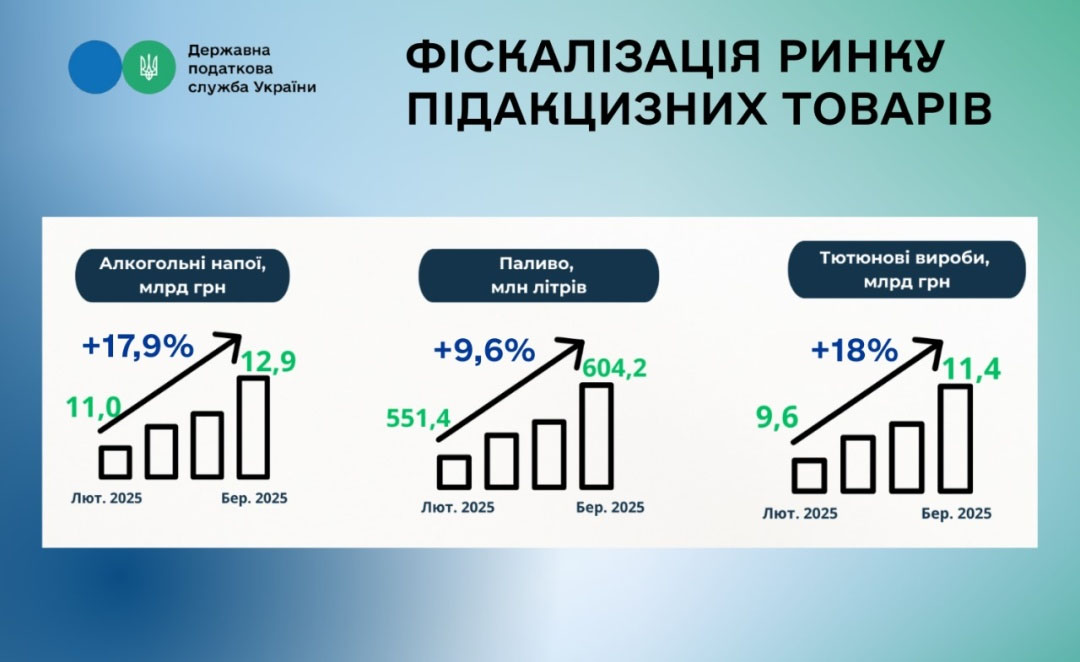 "У березні 2025 року український ринок підакцизних товарів демонструє позитивну тенденцію до зростання виторгів. Державна податкова служба фіксує зростання виторгів від продажу алкоголю, тютюну та пального, здійснених із застосуванням реєстраторів розрахункових операцій", - йдеться в повідомленні.