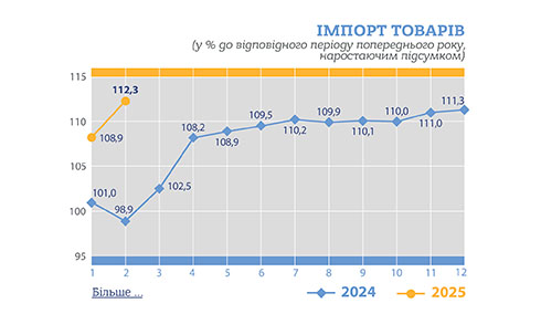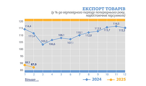 «За січень - лютий 2025 року експорт товарів становив 6 288,1 млн дол. США, або 87,0% порівняно із січнем - лютим 2024 року, імпорт - 11 302,5 млн дол., або 112,3%», - йдеться в повідомленні.