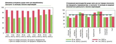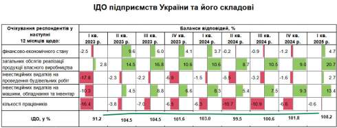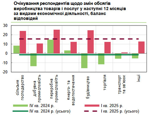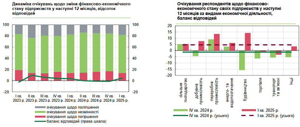 Уперше за останній рік респонденти дали позитивну оцінку перспективам фінансово-економічного розвитку своїх підприємств на найближчі 12 місяців: баланс відповідей склав 4,7% проти -1,2% у четвертому кварталі. Поліпшення очікувань зафіксовано серед більшості галузей, особливо у будівництві та переробній промисловості. Водночас учасники опитування з секторів торгівлі, транспорту та зв'язку залишаються налаштованими песимістично.