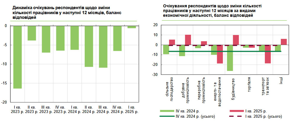 Негативні очікування щодо кількості працівників на підприємствах помітно пом'якшилися: баланс відповідей скоротився до -0,6% з -6,6% у IV кварталі. Зростання зайнятості прогнозували підприємства у сферах добувної промисловості, будівництва, агросектору, переробки та інших видів діяльності. Натомість песимізм зберігався у компаній торгівлі, транспорту, зв'язку, енерго- та водопостачання.