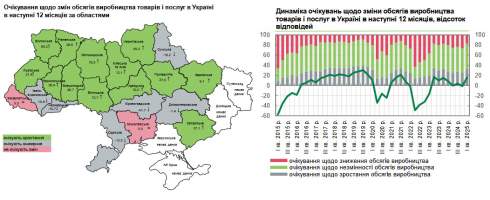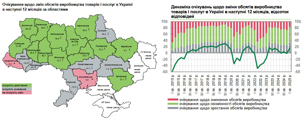 За результатами опитування, підприємства у 14 областях, незалежно від розміру, типу та сфери діяльності, очікували на пожвавлення ділової активності. Бізнес значно покращив очікування щодо обсягів виробництва товарів і послуг в Україні на найближчі 12 місяців: баланс відповідей зріс до 15,6% порівняно з -1,4% у четвертому кварталі 2024 року.
