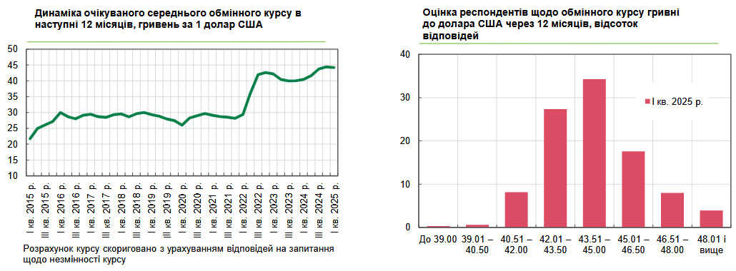 Водночас уже другий квартал поспіль спостерігається зниження впливу валютного чинника - загалом на 5,4 в. п., до 70%. Середній курс долара, якого респонденти очікують через рік, становить 44,23 грн/$1, тоді як і минулому кварталі респонденти очікували 44,42 грн/$1. При цьому 61,6% опитаних прогнозують курс у межах 42,01-45,00 грн/дол. США.