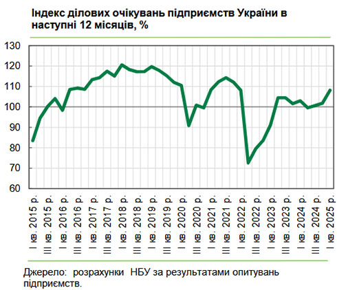 Бізнес у першому кварталі 2025 році залишається оптимістичним щодо зростання ділової активності в наступні 12 місяців: індекс ділових очікувань (ІДО) зріс до 108,2% з 101,8% у четвертому кварталі минулого року, повідомив Національний банк України (НБУ).