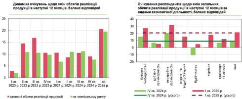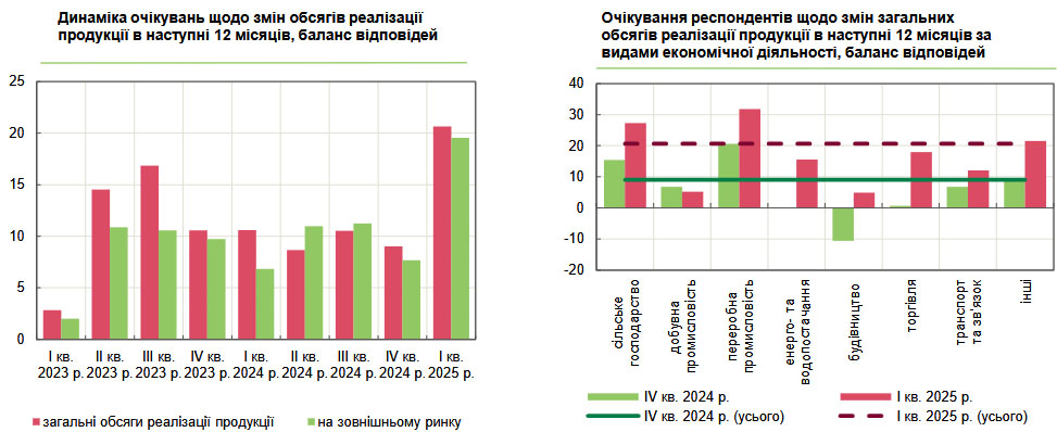 Учасники опитування суттєво покращили очікування щодо змін у реалізації продукції, як на внутрішньому, так і на зовнішньому ринку: баланси відповідей зросли до 20,7% і 19,5%, тоді як в IV кварталі ці показники становили 9,0% та 7,7% відповідно.