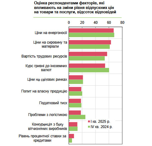 В той же час, як свідчать відповіді респондентів, інфляційні очікування бізнесу стали більш песимістичними: у I кварталі прогнозована річна інфляція на наступні 12 місяців зросла до 11,5% порівняно з 10,3% у попередньому кварталі. При цьому 60,3% респондентів очікували інфляцію понад 10%.