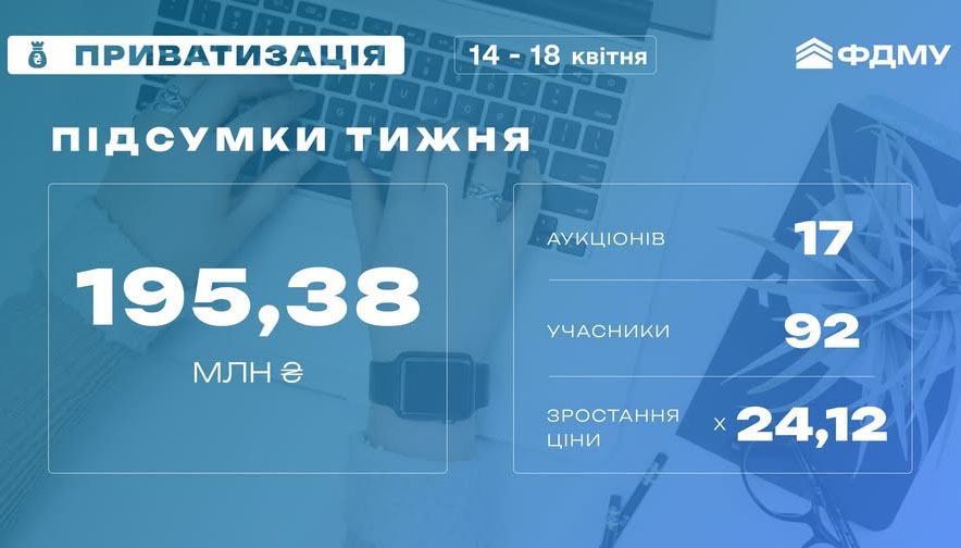 Фонд державного майна України провів 14-18 квітня 17 успішних аукціонів із приватизації, на яких залучив ₴195,38 мільйона.