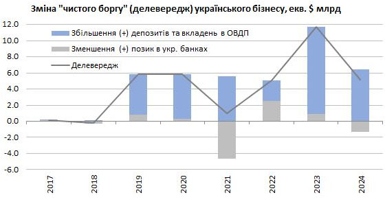 Згідно з опублікованою інформацією, за три останні роки (2022-2024) місцевий бізнес зменшив чистий борг (тобто збільшив свої ліквідні кошти/депозити та зменшив свої борги перед українськими банками) приблизно на $21 млрд. З них кредити бізнесу зменшилися на $2-2,8 млрд (залежно від того, як рахувати), депозити збільшилися на $16-17,7 млрд, вкладення бізнесу в ОВДП зросли приблизно на $2,4 млрд.