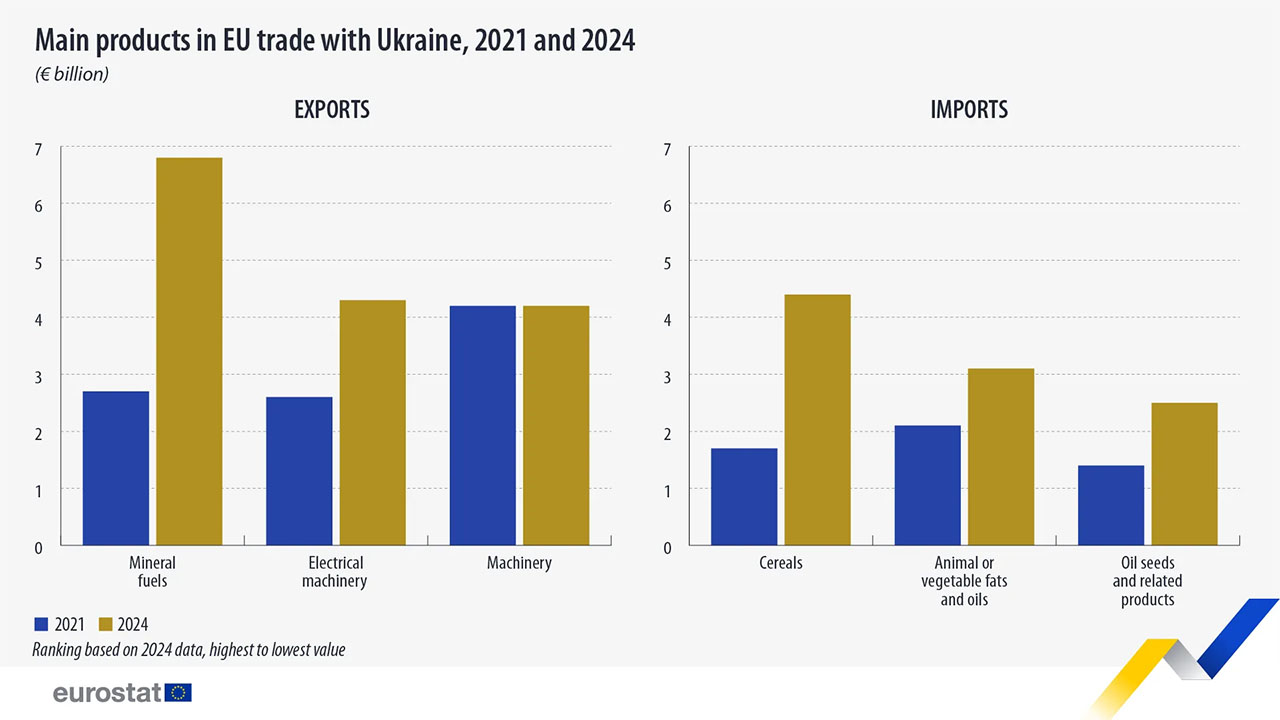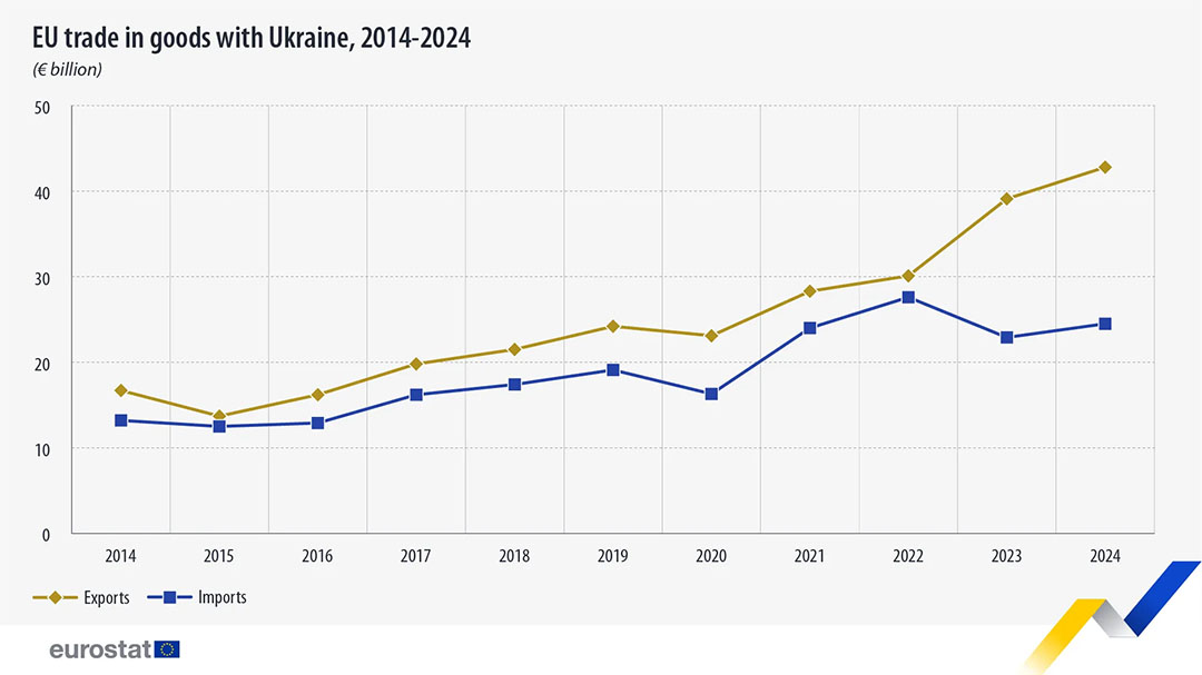 У 2024 році Європейський Союз експортував до України рекордний обсяг товарів на суму 42,8 мільярда євро та імпортував на 24,5 мільярда євро, що призвело до профіциту торгівлі в розмірі 18,3 мільярда євро. Про це свідчать дані Євростату