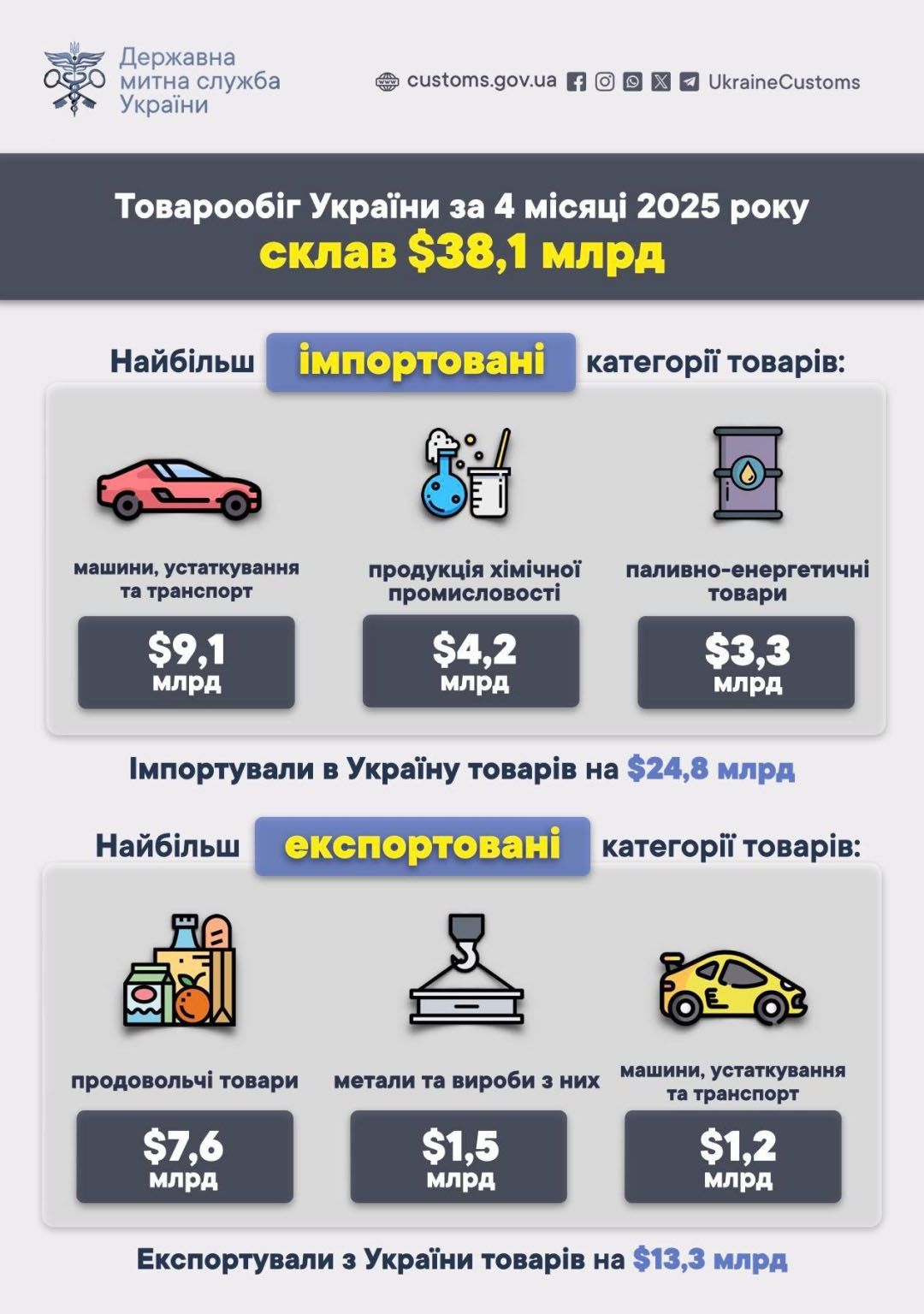 Зазначається, що за перші чотири місяці 2025 року Україна імпортувала товарів на 24,8 млрд дол. США, а експортувала товарів на 13,3 млрд дол. США.