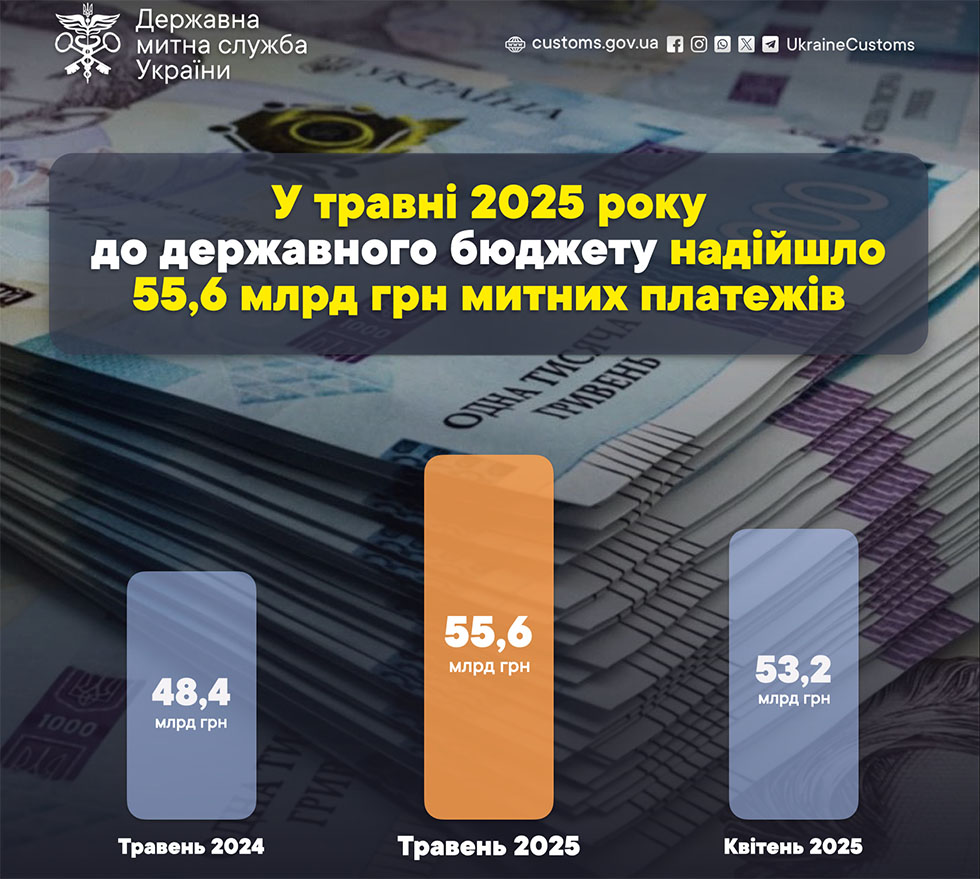 Державна митна служба України у травні забезпечила надходження до державного бюджету 55,6 млрд гривень митних платежів, що на 14,9% більше порівняно з аналогічним періодом минулого року.