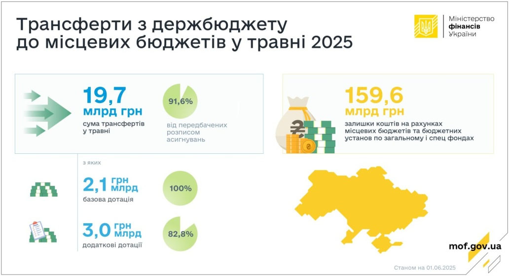 Міністерство фінансів у травні 2025 року забезпечило перерахування 19,7 млрд грн трансфертів до місцевих бюджетів.