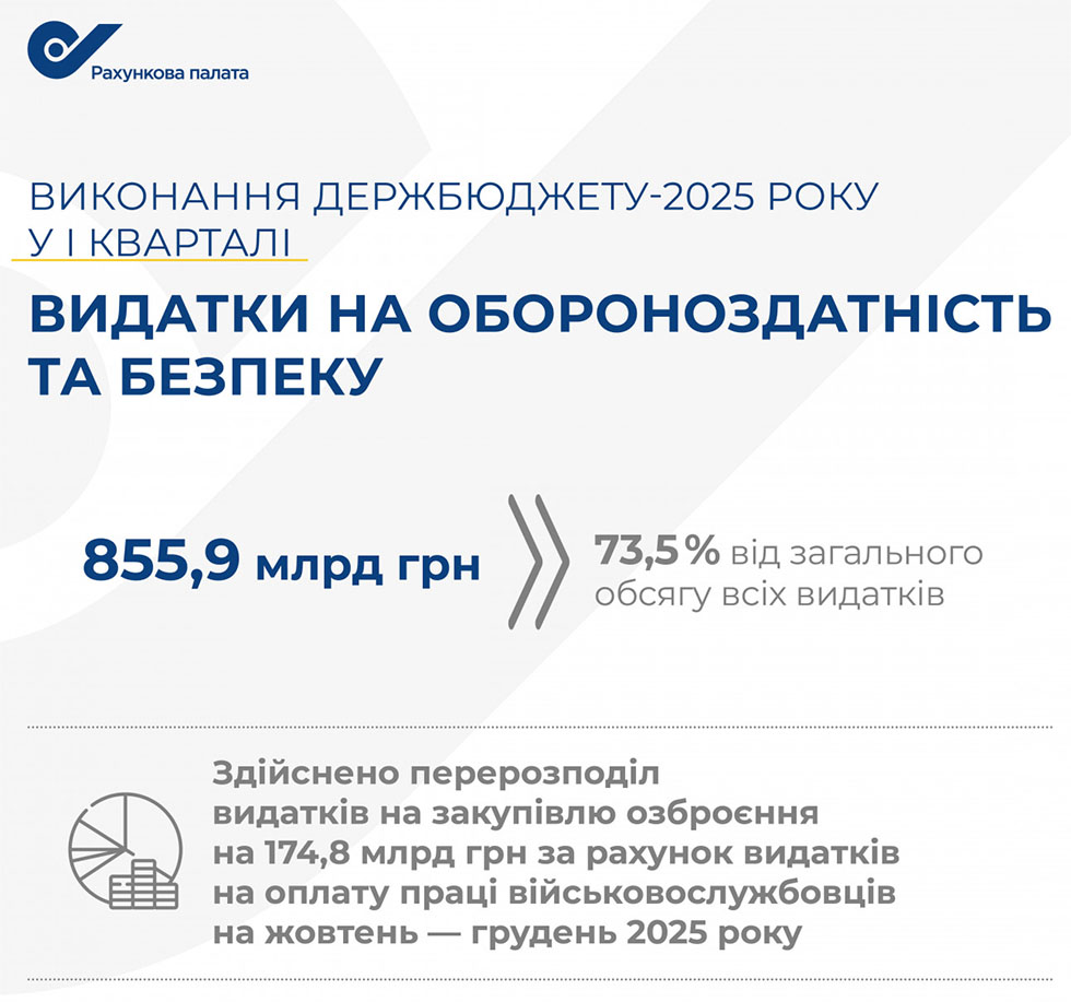 Рахункова палата оприлюднила аналіз виконання закону про державний бюджет України на 2025 рік у першому кварталі. Видатки на оборону значно зросли.