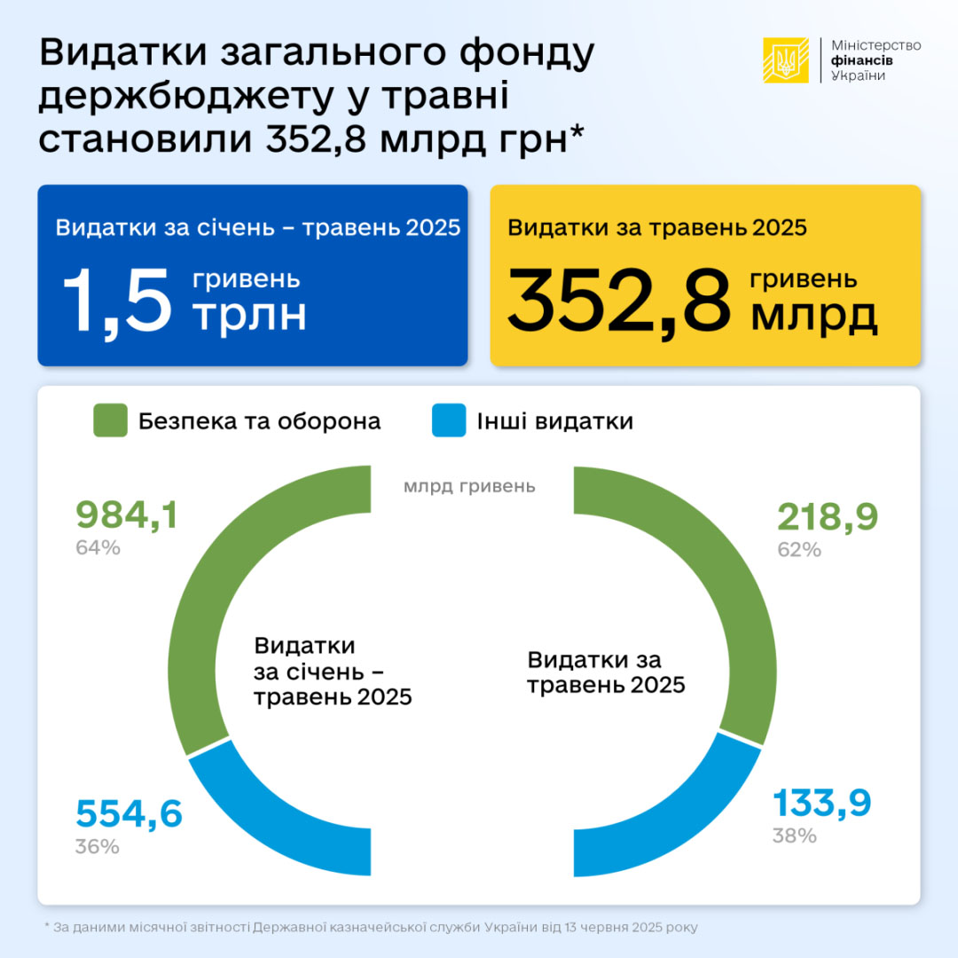 Видатки загального фонду державного бюджету у травні 2025 року становили 352,8 млрд грн, а загалом за перших п'ять місяців - 1,5 трлн грн, що на 22,3% більше порівняно з аналогічним періодом торік.