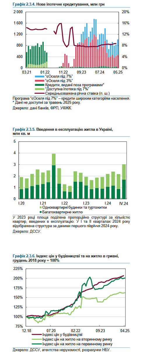 Зазначається, що середньомісячні обсяги нових іпотечних кредитів у першому півріччі 2025 року на чверть менші, ніж у другому півріччі 2024-го. При цьому дещо змінилася структура видач: частка кредитів під 7% за рік зросла з 25% до 40% загальні кількості нових видач.