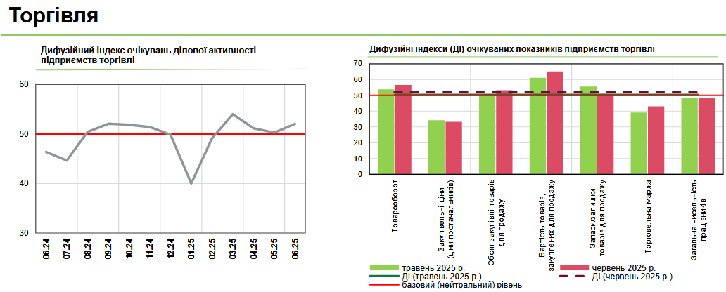 Підприємства торгівлі були найоптимістичнішими, четвертий місяць поспіль демонструючи позитивні оцінки результатів своєї поточної діяльності: секторальний індекс у червні зріс до 52.0 з 50.3 у травні 2025 року (у червні 2024 року - 46.4). Торговельні компанії впевненіше очікували на збільшення обсягу товарообороту та обсягу закупівлі товарів для продажу, а також послабили очікування щодо зменшення залишків товарів для продажу. Респонденти, як і раніше, очікували на зниження торговельної маржі, хоча і дещо нижчими темпами.