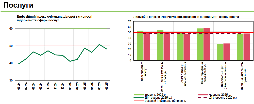 Підприємства сфери послуг на відміну від попереднього місяця послабили оцінки результатів своєї поточної діяльності, зважаючи на збільшення витрат бізнесу через здорожчання палива та дефіцит кваліфікованих кадрів: секторальний індекс становив 48.3 у червні (у травні 2025 року - 50.9, у червні 2024 року - 39.7). Респонденти очікували обсяги наданих послуг на рівні попереднього місяця, водночас послабили очікування щодо нових замовлень на послуги та послуг у процесі виконання.